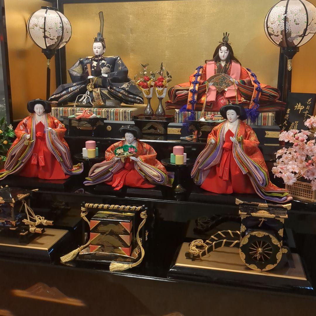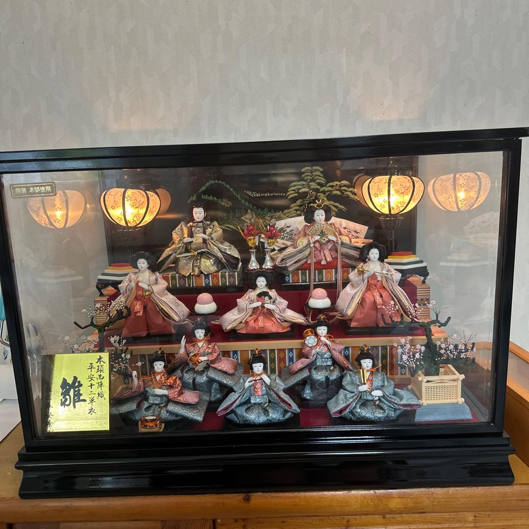 雅ひな 正絹西陣織 本頭極上仕上屏風 遠山桜提灯に少し汚れあります雛人形の種類: ひな祭り用の雛人形- 段数: 三段- 装飾品: 提灯、花、和菓子- 人形の数: 5体- 台座の材質: 木製写真立て付き、オルゴール付いてますがなりません秀光人形工房20年前に18万程で購入しました 2回飾った程度で状態はいいですレビュー